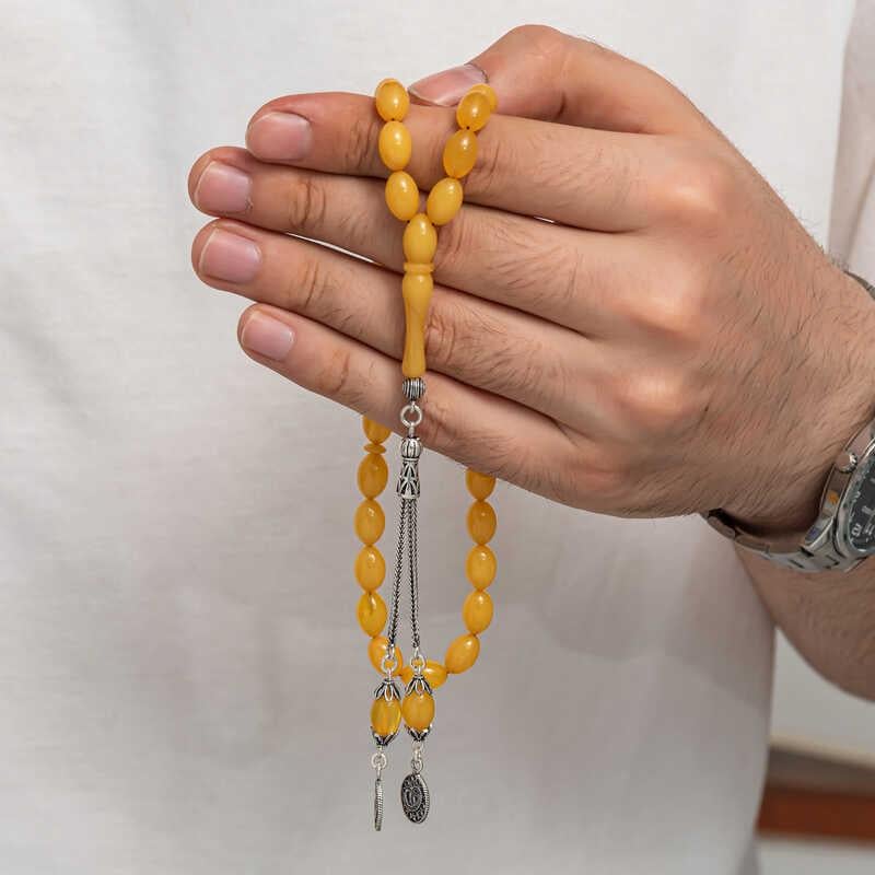 Kehribar, çam ağacı reçinesinin toprak altında uzun yıllar boyunca birikerek oluşan bir maddedir. Hemen hemen taş ile aynı sertliktedir fakat yoğunluğu düşüktür. Çam kokusu yayar. Oluşumu uzun zaman aldığından ve yapay olarak yapılamadığından değerli bir maddedir. Sıkma kehribar ise kehribar taşından farklı olarak onun özelliklerini taşıyan, görüntü itibariyle ona benzeyen fakat gerçek olmayan bir malzemedir. Ülkemizde ve dünyanın bir çok yerinde kehribar taşından çeşitli malzemeler üretilmiştir. Ülkemizde en yaygın olarak tesbih üretilmektedir. Kehribar tesbihler elde ısındıkça kehribar benzeri bir koku verir ve renk değiştirir. Bir çok rengi vardır. Hatta iki rengin birleşiminden oluşan kehribar tesbih modelleri de vardır. Genellikle gümüş püskül ile kullanılır veya sistemli olarak da kullanılabilir. Ülkemizin güzide tesbih ustaları bu malzemeyi sıklıkla işlemek suretiyle çeşitli sanat eserleri meydana getirirler. Bu tesbihler de koleksiyonerler tarafından alınıp satılmaktadır. Gümüş püsküllü sıkma kehribar tesbih modeli de günlük hayatta kullanılabilecek çok şık bir tesbih çeşididir. Özel günlerin vazgeçilmez hediyesi sıkma kehribar tesbihler erkekler için doğum günü, sevgililer günü ve babalar günü gibi özel zamanlarda hediye olarak tercih edilebilir. Gümüş püsküllü sıkma kehribar tesbih modeli diğer kehribar tesbih modellerinde olduğu gibi tamamen el emeği ile imal edilmiştir.