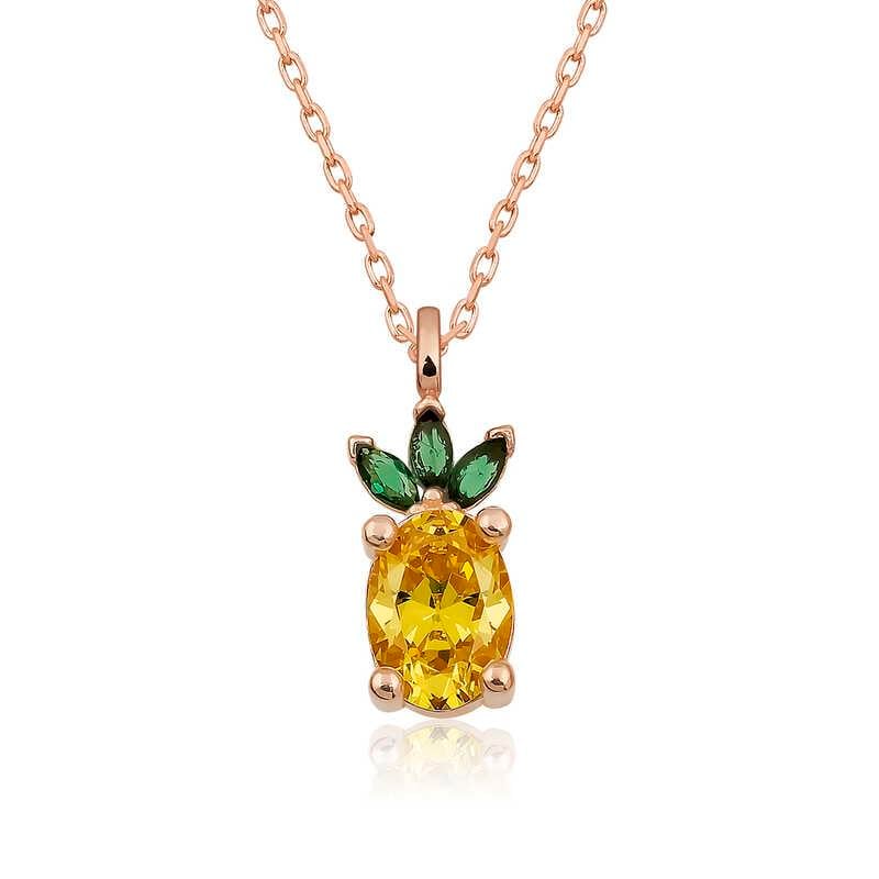 Yaz sezonunun en çok tercih edilen aksesuarları, renkli meyve konseptiyle favorileriniz arasında yer alacak. Meyve konsepti aksesuarlar yazın çok konuşulan kolyeleri olacak ve günlük stilinize renk katacak. Bu şık ananas figür kolye; doğum günü hediyesi, sevgililer günü hediyesi veya özel günlerde tercih edilebilecek mükemmel bir seçenektir. Gümüş zirkon taşlı ananas figür meyve kolye 925 ayar gümüşten imal edilmiştir. Bu kolye üzerine rose kaplama yapılmıştır. Rose kaplama yapılan ürünler parlaklığını uzun süre muhafaza eder, oksitlenmesini geciktirir. Tüm gümüş bayan kolye modellerinde olduğu gibi gümüş ananas figürlü meyve kolye modeli de el emeği ile üretilmiştir. Gümüş ve değerli taşlar nedeniyle belirtilen ortalama ürün ağırlığında ± %10 sapma olabilmektedir.
