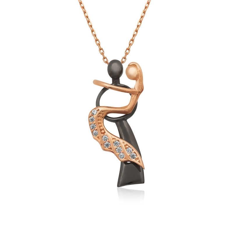 Dans eden iki aşıktan oluşan gümüş kolye günlük hayatta severek kullanabileceğiniz ve sevdiklerinize özel günlerde hediye edebileceğiniz hoş bir aksesuardır. Sevgililer günü, yıl dönümü veya sevgilinizin doğum gününde iyi bir hediye arıyorsanız bu şık kolye tam size göre... Aksesuar olarak son derece şık bir tasarıma sahip olan bu kolye dilerseniz günlük hayatta dilerseniz, davetlerde kullanabileceğiniz her kıyafetinize uyacak oldukça başarılı bir tasarımdır. Sevdiklerine eşsiz bir hediye vermek isteyen kişiler için kaçırılmayacak bir fırsattır. Dans eden çift bayan kolye modeli 925 ayar gümüşten imal edilmiştir. Gümüş üzerine rose altın kaplama yapılmıştır. Rose altın kaplama yapılan gümüş bayan kolye modelleri parlaklığını uzun süre muhafaza eder ve oksitlenmesi gecikir. Kolye üzerinde bulunan taşlar zirkondur. Gümüş kolyenin ortalama boyu 45 cm\"dir. Tüm bayan kolye modellerinde olduğu gibi gümüş anahtar bayan kolye modeli de el emeği ile üretilmiştir. Gümüş ve değerli taşlar nedeniyle belirtilen ürün ağırlığında ± %10 sapma olabilmektedir.