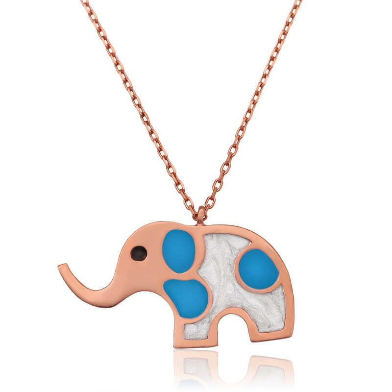 Fil; bilgelik, yetenek, iyi şans ve bereketin sembolüdür. Bu şık kolye; doğum günü hediyesi, sevgililer günü hediyesi veya annelere hediye olarak özel günlerde tercih edilebilecek mükemmel bir seçenektir. Bu anlamlı kolye 925 ayar gümüşten imal edilmiştir. Gümüş üzerine rose kaplama yapılmıştır. Rose kaplama yapılan gümüş kolyeler parlaklığını uzun süre muhafaza eder, gümüşe pembe rengini verir ve oksitlenmeyi geciktirir. Zincir boyu ortalama 45 cm\"dir. Tüm gümüş kolye modellerinde olduğu gibi bu gümüş fil bayan kolye modeli de el emeği ile üretilmiştir. Gümüş ve değerli taşlar nedeniyle belirtilen ortalama ürün ağırlığında ± %10 sapma olabilmektedir.