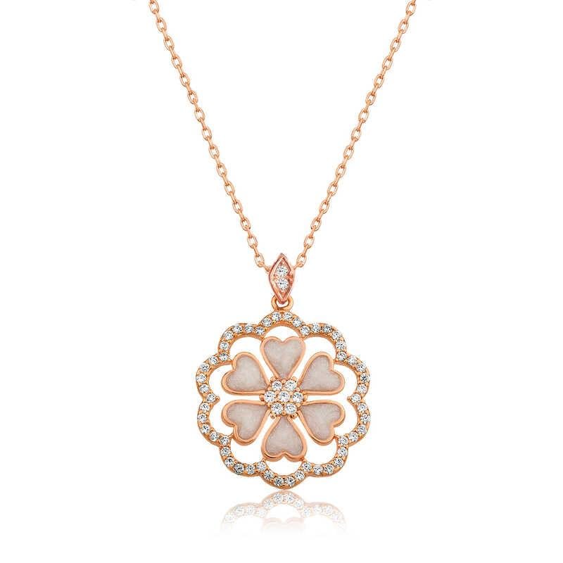 Kalpli yapraklardan oluşan şık çiçek desenli gümüş kolye modeli severek kullanabileceğiniz ve sevdiklerinize armağan edebileceğiniz hoş bir aksesuardır. Kalp yapraklı çiçekten oluşan özel tasarım bayan kolye modeli 925 ayar gümüşten imal edilmiştir. Bu zarif kolye genç aşıkların özel günlerde tercih edebileceği çok şık bir seçenek olacaktır. Bu özel kolye ile sevdiğinizin boynunu aşkla süsleyin. Gümüş kalp çiçek bayan kolye modeli üzerinde rose altın kaplama ve beyaz sedefli mine bulunmaktadır. Rose altın kaplama yapılan gümüş bayan kolye modelleri parlaklığını uzun süre muhafaza eder. Gümüş kalp çiçek bayan kolye sizin olduğu kadar sevdiklerinizin de keyifle takacağı en güzel hediyelerden biri olacaktır. Tüm gümüş bayan kolye modellerimizde olduğu gibi gümüş kalp çiçek bayan kolye de el emeği ile üretilmiştir. Gümüş ve değerli taşlar nedeniyle belirtilen ortalama ürün ağırlığında ± %10 sapma olabilmektedir.