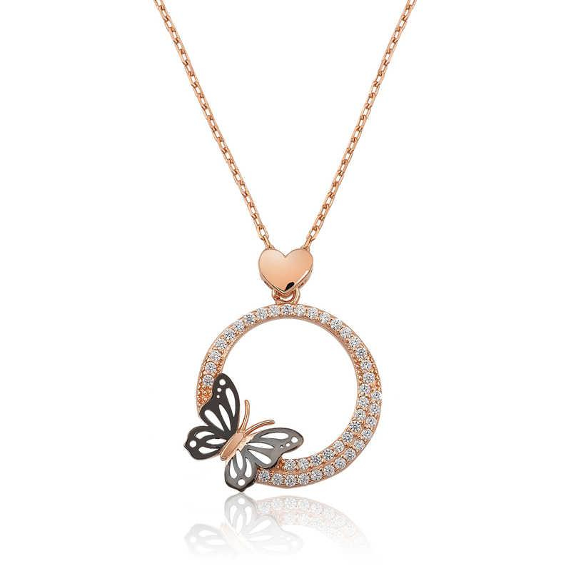 Gümüş Rose Kalpli Kelebek Çemberi Kolye