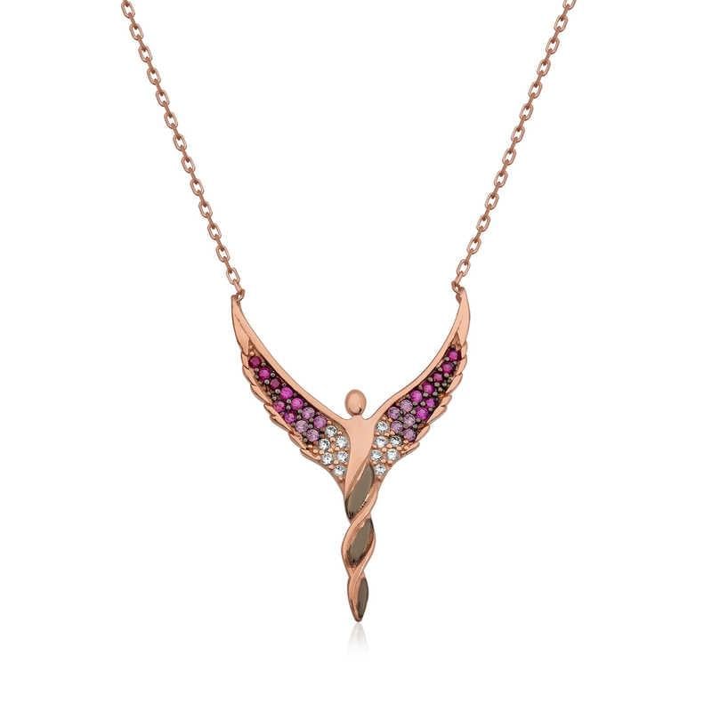Tüm dinlerde günahsız varlıkları simgeleyen melekler Allah’ın hizmetindeki sadık kullarıdır. Hangi dinde olursa olsun meleklere inanmak imanın şartları arasında yer alır. Meleklerin çeşitli görevleri olup insanları korumak için görevlendirilen pek çok melek olduğu bilinmektedir. Melek kolye ile sizde sevdiklerinizin korunmasını dileyebilirsiniz. Melek kolye kime verildiğine bağlı olarak anlam itibari ile çok büyük bir farka sahiptir. Saflığı, masumiyeti simgeleyen melek figürlü aksesuarlar sevdiğiniz kişilere alınabilecek en güzel hediye seçeneklerinden biridir. Hayatınızda değer verdiğiniz mutlu etmek istediğiniz sevdiklerinizi, meleklere layık bir hediye ile sevindirin. Gümüş kanatlı melek kolye modeli 925 ayar gümüşten imal edilmiştir. Gümüş üzerine rose altın kaplama yapılmıştır. Rose altın kaplama yapılan gümüş bayan kolye modelleri parlaklığını uzun süre muhafaza eder ve oksitlenmesi gecikir. Kolye üzerinde bulunan taşlar zirkondur. Gümüş kolye ortalama boyu 45 cm\"dir. Tüm bayan kolye modellerinde olduğu gibi gümüş kanatlı melek kolye modeli de el emeği ile üretilmiştir. Gümüş ve değerli taşlar nedeniyle belirtilen ortalama ürün ağırlığında ± %10 sapma olabilmektedir.