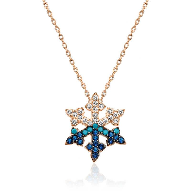 Kadınların ışıltısı, berraklığı kar tanesine benzetilip özel olarak tasarlanmıştır. Kar tanelerinin her birinin bayanlar gibi eşsiz ve ayrı kıymette olması onları özel kılan bir diğer özelliktir. Kar tanesinin asilliği her dönemde dikkat çekmeyi başarmıştır. Bunun yanında insanların tıpkı kar taneleri gibi birbirlerine zarar vermeden de mutlu bir şekilde yaşayabileceklerini sembolize etmektedir. Bu şık kolye; doğum günü hediyesi, sevgililer günü hediyesi veya annelere hediye olarak özel günlerde tercih edilebilecek mükemmel bir seçenektir. Kolye, 925 ayar gümüşten imal edilmiştir. Gümüş üzerine rose altın kaplama yapılmıştır. Rose altın kaplama yapılan ürünler parlaklığını uzun süre muhafaza eder, gümüşü pembe renge dönüştürür ve oksitlenmesi gecikir. Tüm gümüş bayan kolyelerde olduğu gibi bu gümüş kar tanesi bayan kolye de tamamı el emeği ile üretilmiştir. Gümüş ve değerli taşlar nedeniyle belirtilen ortalama ürün ağırlığında ± %10 sapma olabilmektedir.