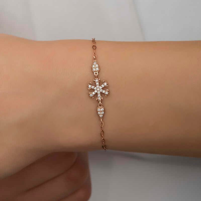 Kadınların ışıltısı, berraklığı kar tanesine benzetilip özel olarak tasarlanmıştır. Kar tanelerinin her birinin kadınlar gibi eşsiz ve ayrı kıymette olması onları özel kılan bir diğer özelliktir. Kar tanesinin asilliği her dönemde dikkat çekmeyi başarmıştır. Bunun yanında insanların tıpkı kar taneleri gibi birbirlerine zarar vermeden de mutlu bir şekilde yaşayabileceklerini sembolize etmektedir. Bu şık bileklik; doğum günü hediyesi, sevgililer günü hediyesi veya annelere hediye olarak özel günlerde tercih edilebilecek mükemmel bir seçenektir. Bileklik, 925 ayar gümüşten imal edilmiştir. Gümüş üzerine rose kaplama yapılmıştır. Rose kaplama yapılan ürünler parlaklığını uzun süre muhafaza eder, gümüşü pembe renge dönüştürür ve oksitlenmesi gecikir. Tüm gümüş bilekliklerde olduğu gibi bu gümüş rose kar tanesi kadın bileklik de tamamı el emeği ile üretilmiştir. Gümüş ve değerli taşlar nedeniyle belirtilen ortalama ürün ağırlığında ± %10 sapma olabilmektedir.