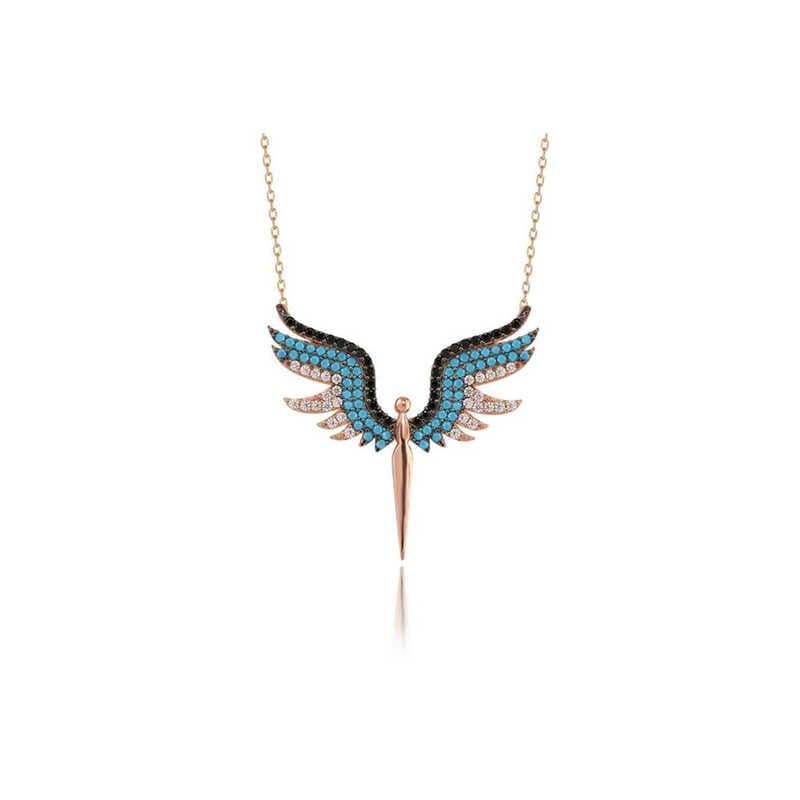 Hz. Mikail dinimizde ki dört büyük meleklerden biridir. Cenab-ı Hak tarafından kendisine görev verilmiştir. Mikail kelimesinin kökeni İbranicedir. İbranicede "Kim tanrı gibidir?" anlamı çıkmaktadır. Mikail aleyhisselam Kur\"an-ı Kerim\"de de ismi geçen bir melektir. Kur\"an-ı Kerim\"de Hz. Mikail (A.S)\"dan beş yerde söz edilmektedir. Mikail meleği aynı zamanda Musevilikte de geçmektedir. Musevilikte İsrailoğullarını kurtarmaya gelen koruyucu melek olarak Hz. Mikail (A.S) adlandırılır. Ayrıca gök ordusunun reisi olarak da adlandırılmaktadır. Musevilikte İblis\"e karşı savaşan melek olarak da adlandırılmaktadır. Bu şık ve anlamlı kolye; doğum günü hediyesi, sevgililer günü hediyesi veya annelere hediye olarak özel günlerde tercih edilebilecek mükemmel bir seçenektir. Kolye, 925 ayar gümüşten imal edilmiştir. Gümüş üzerine rose altın kaplama yapılmıştır. Rose altın kaplama yapılan ürünler parlaklığını uzun süre muhafaza eder, gümüşü pembe renge dönüştürür ve oksitlenmesini geciktirir. Tüm gümüş bayan kolyelerde olduğu gibi bu gümüş mikail meleği bayan kolye de tamamı el emeği ile üretilmiştir. Gümüş ve değerli taşlar nedeniyle belirtilen ortalama ürün ağırlığında ± %10 sapma olabilmektedir.