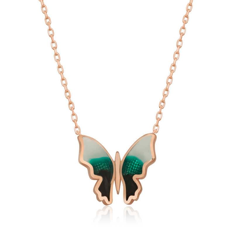 Özgürlüğü masumiyeti ve saflığı simgeleyen kelebekler, tertemiz sevginin ve aşkın ifadesidir. Bahar kelebekleri kolye anlam itibari ile aşkın küçük bir kıvılcım ile başladığı daha sonra büyük bir sabır ile büyüdüğü ve en sonunda ilan-ı aşkı ifade eder. Sizin olduğu kadar sevdiklerinizin de keyifle takacağı minimal kelebek bayan kolye en güzel hediyelerden biri olacaktır. Kolye 925 ayar gümüşten imal edilmiştir. Gümüş üzerine rose kaplama yapılmıştır. Rose kaplama yapılan gümüş bayan kolyeler parlaklığını uzun süre muhafaza eder, ve oksitlenmeyi geciktirir. Kolye üzerinde bulunan renkler mine işlemesidir. Gümüş olan zincir boyu ortalama 45 cm\"dir. Tüm gümüş bayan kolyelerde olduğu gibi gümüş minimal kelebek bayan kolye de el emeği ile üretilmiştir. Gümüş ve değerli taşlar nedeniyle belirtilen ürün ağırlığında ± %10 sapma olabilmektedir.