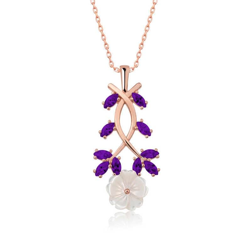 Gümüş Rose Mor Yapraklı Bahar Çiçeği Kolye