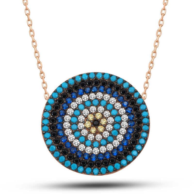 Birçok kültürde kötü enerjinin zararlarından korunmak için çeşitli tılsımlar kullanılmıştır. Doğu kültürlerinin çoğunda kullanılan tılsım ise gözdür. Nazar boncuğu da göz şeklinden ilhamla tasarlanmıştır. Mavi rengin seçilmesi de tesadüf değildir. Renkli gözlü kişilerin enerjisini daha etkili yansıttığı inancı gereği nazar boncukları çoğunlukla mavi olarak tasarlanır. Güzelliğiyle göz kamaştıran, nazardan korunmasını istediğiniz kişilere ve sevdiklerinize nazar kolyeyi armağan edebilirsiniz. Nazar kadın kolye modeli 925 ayar gümüşten imal edilmiştir. Gümüş üzerine rose kaplama yapılmıştır. Rose kaplama yapılan gümüş nazar kolye modelleri parlaklığını uzun süre muhafaza eder ve oksitlenmesi gecikir. Kolye üzerinde bulunan taşlar zirkon\"dur. Bu nazar kadın kolye modeli diğer tüm gümüş kadın kolye modellerinde olduğu gibi el emeği ile üretilmiştir. Gümüş ve değerli taşlar nedeniyle belirtilen ortalama ürün ağırlığında ± %10 sapma olabilmektedir.