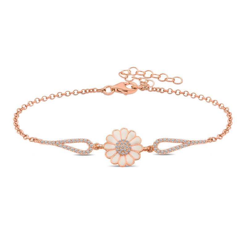 Papatya çiçeği, temiz sevgi anlamını ifade eder. En büyük özelliklerinden biri her sapında bir tane olmasıdır. Bu güzellik tasarlanarak ortaya çıkan bu ışıl ışıl bileklik, zirkon taşlarla süslenmiştir... Bu şık bileklik; doğum günü hediyesi, sevgililer günü hediyesi veya annelere hediye olarak özel günlerde tercih edilebilecek mükemmel bir seçenektir. Gümüş rose papatya kadın bileklik 925 ayar gümüşten imal edilmiştir. Bu bileklik üzerinde rose kaplama yapılmıştır. Rose kaplama yapılan ürünler parlaklığını uzun süre muhafaza eder. Üzerinde bulunan taşlar zirkon\"dur. Tüm gümüş kadın bileklik modellerinde olduğu gibi gümüş rose papatya kadın bileklik modeli de el emeği ile üretilmiştir. Gümüş ve değerli taşlar nedeniyle belirtilen ortalama ürün ağırlığında ± %10 sapma olabilmektedir.