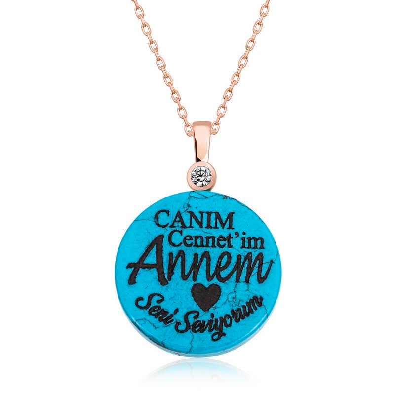 Gümüş Rose Turkuaz Taşlı Annem Yazılı Kadın Kolye