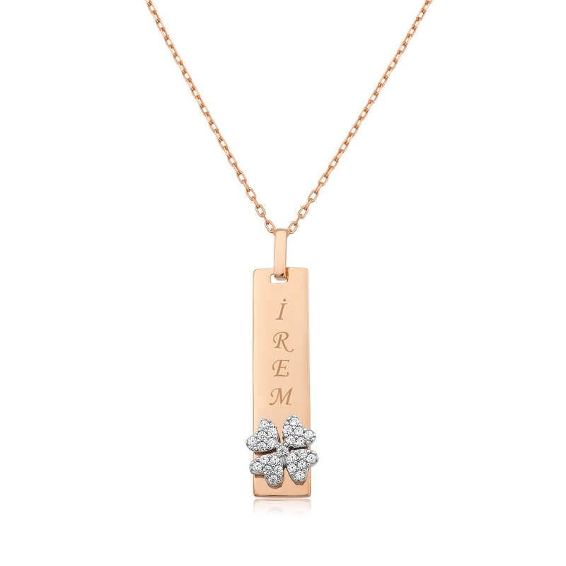 Gümüş Rose Yonca Desenli Plaka Kolye