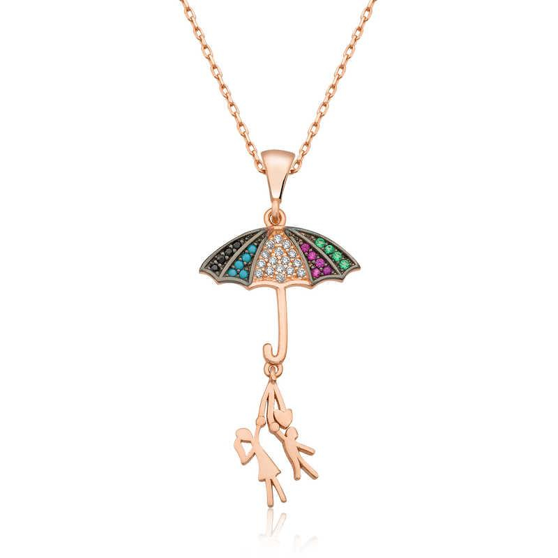 Yağmur altında şemsiyeli aşıklardan esinlenilerek hazırlanmış olan bu özgün tasarımlı gümüş kolye severek kullanabileceğiniz ya da sevdiklerinize yılbaşı, sevgililer günü, doğum günü gibi özel günlerde hediye edebileceğiniz anlamlı bir hediyedir. Kolye 925 ayar gümüşten imal edilmiştir. Gümüş üzerine rose altın kaplama yapılmıştır. Rose altın kaplama yapılan gümüş bayan kolyeler parlaklığını uzun süre muhafaza eder, gümüşü pembe renge dönüştürür ve oksitlenmeyi geciktirir. Kolye üzerinde bulunan taşlar zirkon\"dur. Gümüş olan zincir boyu ortalama 45 cm\"dir. Tüm gümüş bayan kolyelerde olduğu gibi gümüş kelebek çemberi kolye de el emeği ile üretilmiştir. Gümüş ve değerli taşlar nedeniyle belirtilen ürün ağırlığında ± %10 sapma olabilmektedir.