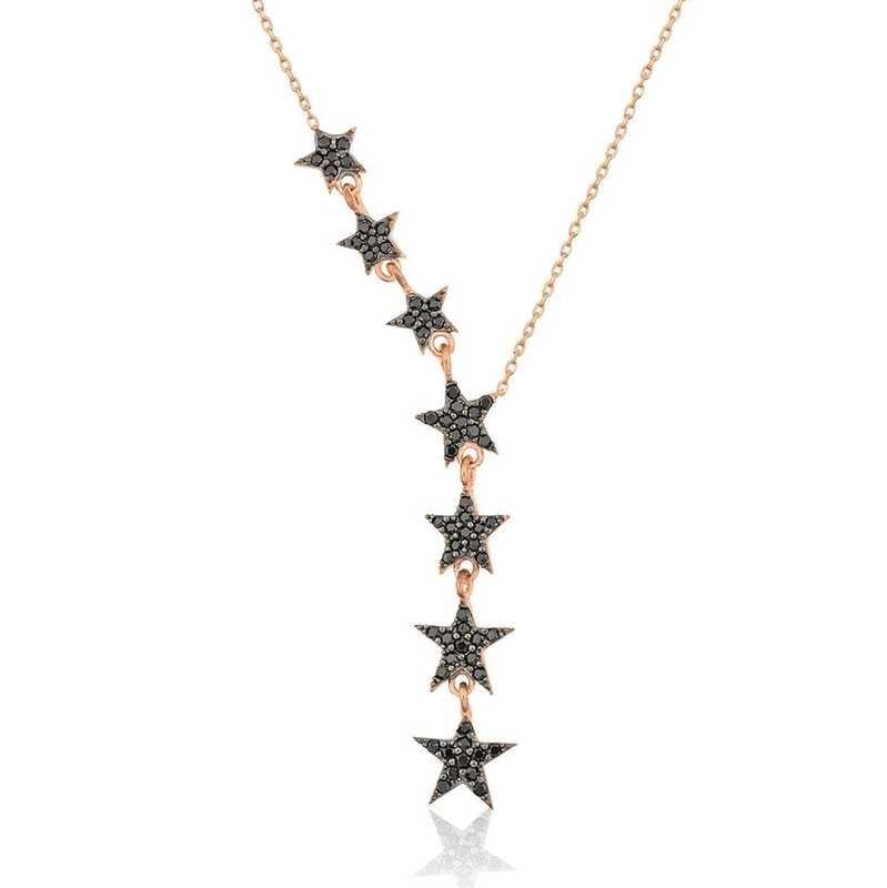 Gecenin parlak ışıltısını anımsatan yıldız, sembolik olarak evrenin sonsuzluğunu, uzaktaki bir noktayı ifade eder. Parıltının, ışığın, aydınlığın ve umudun sembolüdür. Her insan özel, her sevilen eşsizdir. Eşsiz sevginin ömür boyu sürecek birlikteliğin simgesi gümüş sıralı yıldızlar bayan kolye ile sevdiklerinizi mutlu etmeye ne dersiniz... Kolye 925 ayar gümüşten imal edilmiştir. Gümüş üzerine rose altın kaplama yapılmıştır. Rose altın kaplama yapılan gümüş kolyeler parlaklığını uzun süre muhafaza eder, gümüş rengini pembe renge dönüştürür ve oksitlenmeyi geciktirir. Üzerinde bulunan siyah taşlar zirkondur. Gümüş bayan kolye modellerinin tamamında olduğu gibi gümüş siyah kayan yıldızlar bayan kolye modeli de el emeği ile üretilmiştir. Gümüş ve değerli taşlar nedeniyle belirtilen ortalama ürün ağırlığında ± %10 sapma olabilmektedir.