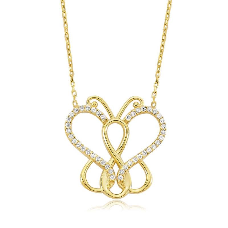 Kelebek kolye tertemiz sevginin ve aşkın ifadesidir. Sonsuz sevginizi sevdiğinize gösterebileceğiniz bir kolye modelidir. Sevdiklerinize alabileceğiniz anlamlı bir hediye bu şık kelebek bayan kolye 925 ayar gümüşten imal edilmiştir. Gümüş üzerine altın kaplama yapılmıştır. Altın kaplama yapılan gümüş bayan kolye modelleri parlaklığını uzun süre muhafaza eder ve oksitlenmesi gecikir. Kolye üzerinde bulunan beyaz taşlar zirkondur. Gümüş olan zincir boyu ortalama 45 cm\"dir. Gümüş sonsuzluk kelebek bayan kolye modeli diğer tüm gümüş bayan kolye modellerinde olduğu gibi el emeği ile üretilmiştir. Gümüş ve değerli taşlar nedeniyle belirtilen ortalama ürün ağırlığında ± %10 sapma olabilmektedir.
