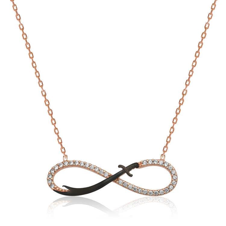Sevgilinize sonsuz aşkı ifade etmenin en güzel, en anlamlı yollarından biri de ona sonsuzluk temalı gümüş takılar hediye etmektir. Sevgilinize hediye edeceğiniz bu özel kolye modeli ile ona olan sonsuz aşkınızı sevginizi ifade edebilir sonsuza kadar birlikte olacağınız mesajı verebilirsiniz. Sonsuzluk zülfikar bayan kolye modeli 925 ayar gümüşten imal edilmiştir. Gümüş üzerine rose altın kaplama yapılmıştır. Rose altın kaplama yapılan gümüş bayan kolye modelleri parlaklığını uzun süre muhafaza eder ve oksitlenmesi gecikir. Kolye üzerinde bulunan beyaz taşlar zirkon\"dur. Gümüş olan zincirin boyu ortalama 45 cm\"dir. Tüm gümüş bayan kolye modellerinde olduğu gibi gümüş sonsuzluk zülfikar kılıcı bayan kolye modeli de el emeği ile üretilmiştir. Gümüş ve değerli taşlar nedeniyle belirtilen ürün ağırlığında ± %10 sapma olabilmektedir.