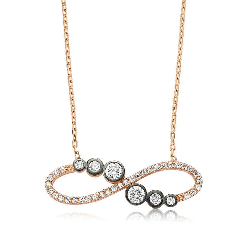 Sevgilinize sonsuz aşkı ifade etmenin en güzel en anlamlı yollarından biri de ona sonsuzluk temalı gümüş kolye hediye etmektir. Sevgilinize hediye edeceğiniz bu özel kolye ile ona olan sonsuz aşkınızı sevginizi ifade edebilir sonsuza kadar birlikte olacağınız mesajı verebilirsiniz. Gümüş süzme suyolu sonsuzluk bayan kolye 925 ayar gümüşten imal edilmiştir. Gümüş üzerine rose altın kaplama yapılmıştır. Rose altın kaplama yapılan gümüş bayan sonsuzluk kolye modelleri parlaklığını uzun süre muhafaza eder ve oksitlenmesi gecikir. Kolye üzerinde bulunan taşlar zirkondur. Gümüş olan zincir boyu ortalama 45 cm\"dir. Tüm bayan kolye modellerinde olduğu gibi gümüş süzme suyolu sonsuzluk bayan kolye de el emeği ile üretilmiştir. Gümüş ve değerli taşlar nedeniyle belirtilen ürün ağırlığında ± %10 sapma olabilmektedir.
