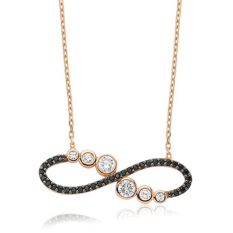 Sevgilinize sonsuz aşkı ifade etmenin en güzel en anlamlı yollarından biri de ona sonsuzluk temalı gümüş kolye hediye etmektir. Sevgilinize hediye edeceğiniz bu özel kolye ile ona olan sonsuz aşkınızı sevginizi ifade edebilir sonsuza kadar birlikte olacağınız mesajı verebilirsiniz. Gümüş süzme suyolu sonsuzluk bayan kolye 925 ayar gümüşten imal edilmiştir. Gümüş üzerine rose altın kaplama yapılmıştır. Rose altın kaplama yapılan gümüş bayan sonsuzluk kolye modelleri parlaklığını uzun süre muhafaza eder ve oksitlenmesi gecikir. Kolye üzerinde bulunan taşlar zirkondur. Gümüş olan zincir boyu ortalama 45 cm\"dir. Tüm bayan kolye modellerinde olduğu gibi gümüş süzme suyolu sonsuzluk bayan kolye de el emeği ile üretilmiştir. Gümüş ve değerli taşlar nedeniyle belirtilen ürün ağırlığında ± %10 sapma olabilmektedir.