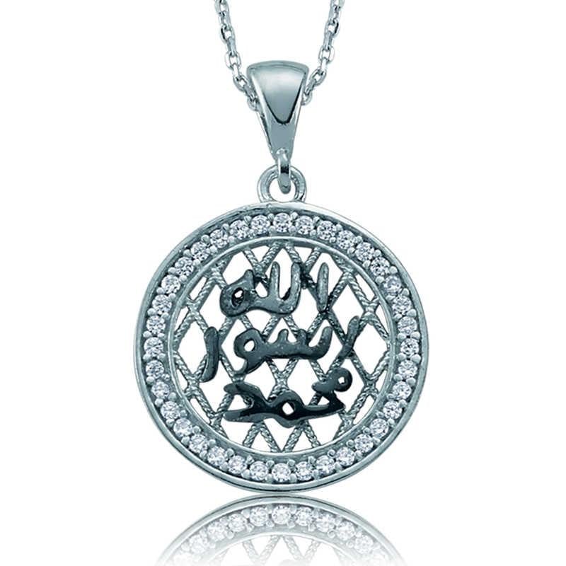 Mühür kelime manasıyla aslen \"\"yüzük\"\" anlamına gelir. Öyle ki Resulullah\"ın mührü aynı zamanda yüzük şeklindeydi. Hz. Muhammed (s.a.v.) Mühr-ü Şeriflerde , üç satır halinde, “Muhammed Resulullah" ibaresi kazınmıştı. Birinci satırda “Muhammed”, ikinci satırda “Resul”, üçüncü satırda da “Allah” kelimeleri yer alıyordu. Sizler de sevdiklerinize bu manevi değeri yüksek gümüş bayan kolyeyi hediye edebilir onları sevindirebilirsiniz. Taşlı Mühr-ü Şerif bayan kolye 925 ayar gümüşten imal edilmiştir. Kolye üzerinde bulunan taşlar zirkondur. Taşlı Mühr-ü Şerif Bayan Kolye gümüş üzerine oksit kaplama yapılmıştır. Gümüş bayan kolye modellerimizin tamamı el emeği ile üretilmiştir. Gümüş ve değerli taşlar nedeniyle ürün ağırlığında ± %10 sapma olabilmektedir.
