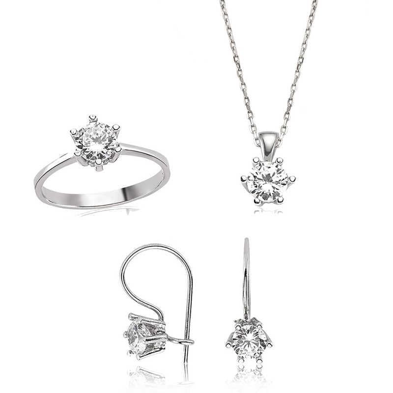 Gümüş ve zirkonun göz kamaştırıcı parlaklığı ile yıldızları anımsatmak isteyenlere bu kolye ve küpe ve yüzükten oluşan set çok yakışacak. 925 ayar gümüşten imal edilen bu set hem sizin, hem de sevdiklerinizin keyifle takacağı spor ve klasik tüm kombinler için tercih edilebilir. Set üzerindeki beyaz taşlar zirkondur. Dilerseniz kendinizi, dilerseniz sevdiklerinizi şık ve ışıl ışıl tek taş set ile sevindirin. Gümüş tek taş bayan set üzerine rodyum kaplama yapılmıştır. Rodyum kaplama yapılan tüm gümüş bayan set modelleri parlaklığını uzun süre muhafaza eder. Sette bulunan kolyenin zincir uzunluğu 45 cm’dir. Tüm gümüş bayan set modellerimizde olduğu gibi gümüş tek taş bayan set de el emeği ile üretilmiştir. Gümüş ve değerli taşlar nedeniyle belirtilen ortalama ürün ağırlığında ± %10 sapma olabilmektedir.