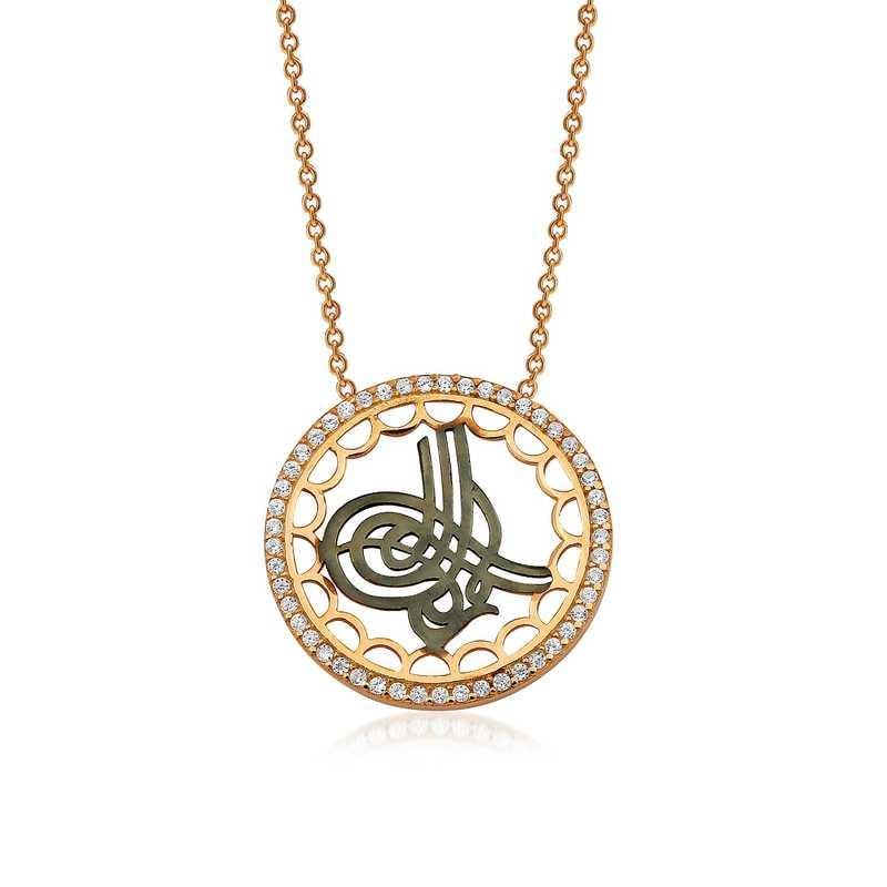 Osmanlı imparatorluğundaki padişahların imzası olarak da kullandığı tuğra sembolü kolye ile birleşerek anlamlı bir gümüş takı haline gelmiştir. Böylelikle sevdiklerinizi veya kendinizi derin bir anlama sahip olan bu kolye ile sevindirebilirsiniz. Tuğra bayan kolye modeli 925 ayar gümüşten imal edilmiştir. Gümüş üzerine rose altın kaplama yapılmıştır. Rose altın kaplama yapılan gümüş bayan kolye modelleri parlaklığını uzun süre muhafaza eder. Kolye üzerinde bulunan beyaz taşlar zirkondur. Gümüş olan zincir boyu ortalama 45 cm\"dir. Gümüş tuğralı bayan kolye modeli diğer tüm gümüş bayan kolye modellerinde olduğu gibi el emeği ile üretilmiştir. Gümüş ve değerli taşlar nedeniyle belirtilen ürün ağırlığında ± %10 sapma olabilmektedir.