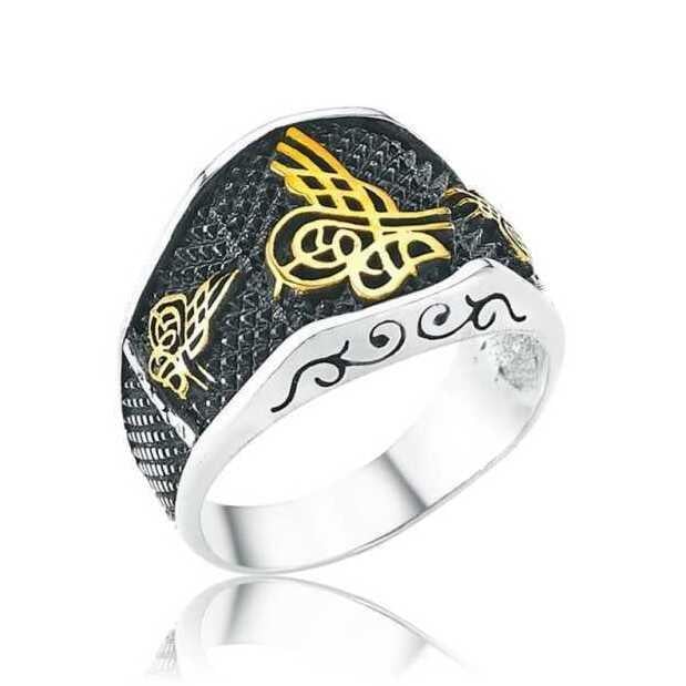 Tuğra, padişahın ismi ve lakabı bulunan alâmet, imza. Tuğra, hat sanatının bir kolu halinde yüzyıllar boyunca usta hattatlar eliyle yazılmıştır. Türkçe’de kelime olarak padişahın ismini ihtiva eden özel bir işaret, padişahın imzası gibi anlamlar ifade eder. Aslı Oğuz lehçesinde tuğra olup, hükümdarın basılmış imzası demektir. Orhan Gazi tarafından kullanılan ilk tuğra Orhan bin Osman ifâdesinden ibâret olup, tuğralardan ilki 1324 diğeri 1348 tarihlidir. Birinci Sultan Osman Gazi\"ye ait bir tuğraya günümüze dek hiçbir yerde rastlanmamıştır. Bu nedenle 36 Osmanlı padişahı; ama 35 Osmanlı padişah tuğrası vardır. Padişahın kendisi ve babasının isminin yazıldığı kısma, taht, kürsü veya sere adı verilir. Buradan sola doğru uzanarak aşağıdan yukarıya doğru uzayan ve iç içe iki kavisten meydana gelen kısma ise, beyze veya sancak adı verilir. Osmanlı imparatorluğunu simgeleyen Tuğra armalı yüzüğü severek kullanabilir ve sevdiklerinize armağan edebilirsiniz. 925 ayar gümüşten imal edilmiştir. Gümüş üzerine oksit kaplama yapılmıştır. Oksit kaplama yapılan ürünler parlaklığını uzun süre muhafaza eder, oksitlenmesi gecikir. Ürünlerimizin tamamı el emeği ile üretilmiştir. Gümüş ve değerli taşlar nedeniyle ürün ağırlığında ± %10 sapma olabilmektedir.