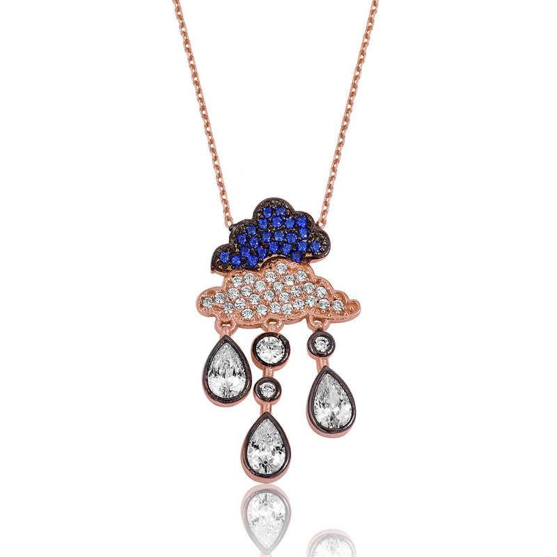 Kolye; doğum günü hediyesi, sevgililer günü hediyesi veya annelere hediye olarak özel günlerde tercih edilebilecek mükemmel bir seçenektir. Bu anlamlı ve şık kolye; 925 ayar gümüşten imal edilmiştir. Bu bayan gümüş kolye üzerine rose kaplama yapılmıştır. Rose kaplama yapılan tüm kolyeler parlaklığını uzun süre muhafaza eder, gümüşü pembe renge dönüştürür ve oksitlenmeyi geciktirir. Zincir boyu ortalama 45 cm\"dir. Yağmur bulutu bayan kolye üzerinde bulunan taşlar zirkondur. Tüm gümüş kolyelerde olduğu gibi bu gümüş yağmur bulutu bayan kolye de el emeği ile üretilmiştir. Gümüş ve değerli taşlar nedeniyle ürün ağırlığında ± %10 sapma olabilmektedir.