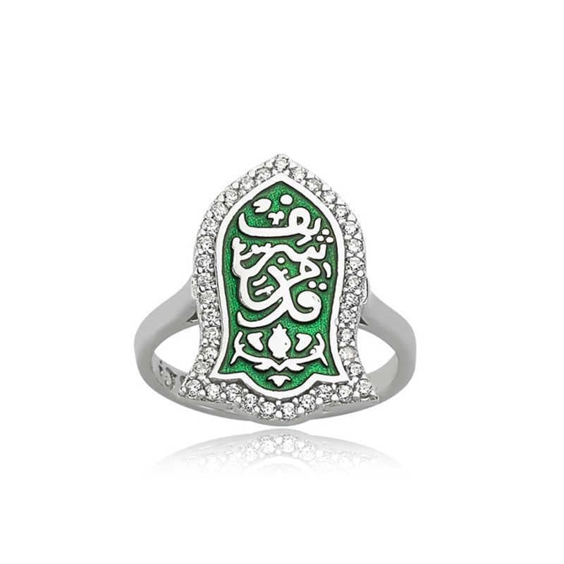 Kademi Şerif, nal-ı şerif’in bir diğer ismidir. Kademi Şerif Peygamber Efendimiz Hz.Muhammed (sav)’in ayağına giydiği nalın şeklindeki sandalettir. Günümüzde Kademi Şerif Peygamber Efendimizin (sav) simgelerinden biri haline gelmiştir. Yüzük 925 ayar gümüşten imal edilmiştir. Gümüş üzerine rodyum kaplama yapılmıştır. Rodyum kaplama yapılan gümüş bayan yüzük modelleri parlaklığını uzun süre muhafaza eder. Yüzük üzerindeki taşlar zirkon\"dur. Yeşil renk soğuk mine yöntemiyle verilmiştir. Ürünlerimizin tamamı el emeği ile üretilmiştir. Gümüş ve değerli taşlar nedeniyle belirtilen ortalama ürün ağırlığında ± %10 sapma olabilmektedir.