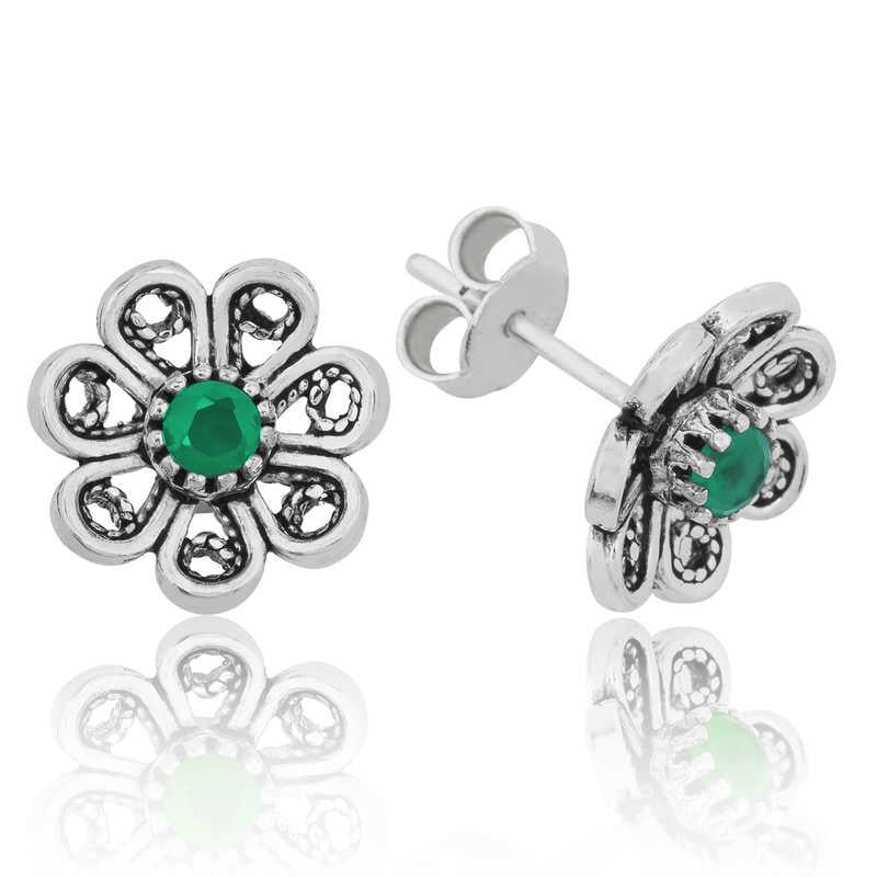 Gümüş Yeşil Telkari Çiçek Çivili Küpe