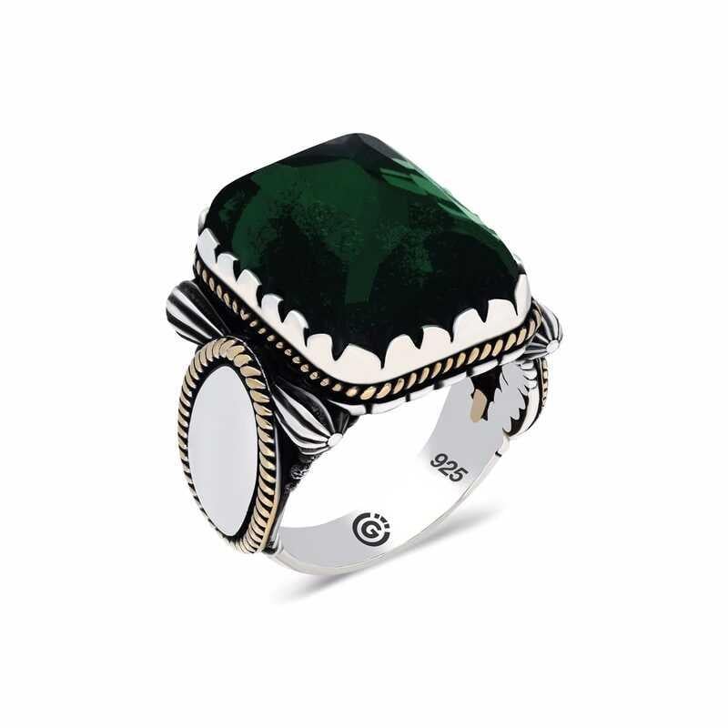 Gümüş Yeşil Zirkon Taşlı Kare Erkek Yüzük
