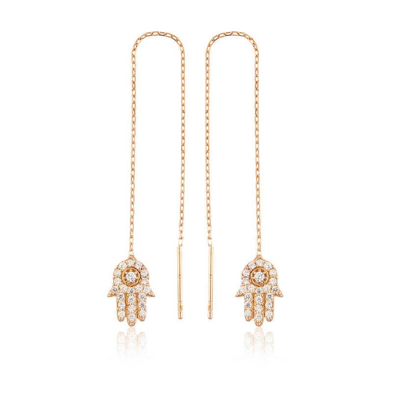 Her ne kadar Hz. Fatma\"nın eli olarak bilinse de arapçada “hamse” diye anılır. Hamse, beş anlamına gelir ve bir elin parmak sayısını gösterir. Hz. Fatma bir gün mutfakta helva kavururken, eşi Hz. Ali görür ve pişen helvaya elini daldırır ancak hiçbir şey olmaz, helvayı böyle kavurmayı devam eder. O günden sonra elinin kutsallığına, gücüne adeta yenilmezliğine inanılır. Her güçlük adeta onun eliyle aşılacaktır. Bu eşsiz küpe; doğum günü hediyesi, sevgililer günü hediyesi veya annelere hediye olarak özel günlerde tercih edilebilecek mükemmel bir seçenektir. Bu harika tasarım Fatma eli bayan bayan küpe; 925 ayar gümüşten imal edilmiştir. Gümüş üzerine rose kaplama yapılmıştır. Rose altın kaplama yapılan tüm gümüş küpe modelleri parlaklığını uzun süre muhafaza eder, gümüşü pembe rengine çevirir, oksitlenmeyi geciktirir Küpe üzerinde bulunan beyaz taşlar zirkondur. Tüm gümüş bayan küpelerde olduğu gibi zincirli Fatma eli bayan küpe de el emeği ile üretilmiştir. Gümüş ve değerli taşlar nedeniyle belirtilen ürün ağırlığında ± %10 sapma olabilmektedir.