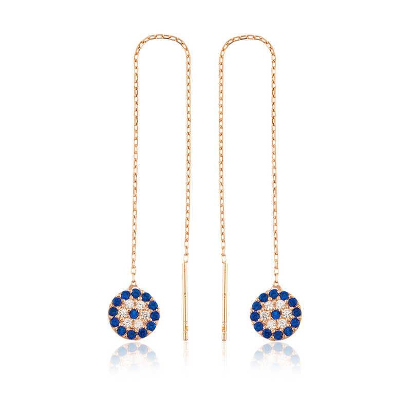 Nazar boncuğunu insanlar uzun yıllardan beri kötü bakıştan korunmak için kullanmışlardır. Kötü bakışların insanlar üzerinde olumsuz etki oluşturmasına karşı bir önlemdir nazar boncuğu… Bu sebeptendir ki insanlar sevdiklerini korumak için nazar boncuğu takmaktadır. Bu nazar küpe de şıklığı ve zarafeti yansıtıyor. Her dönem sevilen ve şıklığından ödün vermeyen bu modeli ; doğum günü hediyesi, sevgililer günü hediyesi veya annelere hediye olarak özel günlerde tercih edebilirsiniz. Gümüş zincirli nazar bayan küpe, 925 ayar gümüşten imal edilmiştir. Gümüş küpe üzerine rose kaplama yapılmıştır. Rose kaplama yapılan gümüş bayan küpeler parlaklığını uzun süre muhafaza eder,gümüşü pembe rengine dönüştürür, oksitlenmesi gecikir. Üzerinde bulunan taşlar zirkondur. Tüm gümüş bayan küpelerde olduğu gibi bu gümüş zincirli nazar bayan küpe de tamamı el emeği ile üretilmiştir. Gümüş ve değerli taşlar nedeniyle belirtilen ortalama ürün ağırlığında ± %10 sapma olabilmektedir.