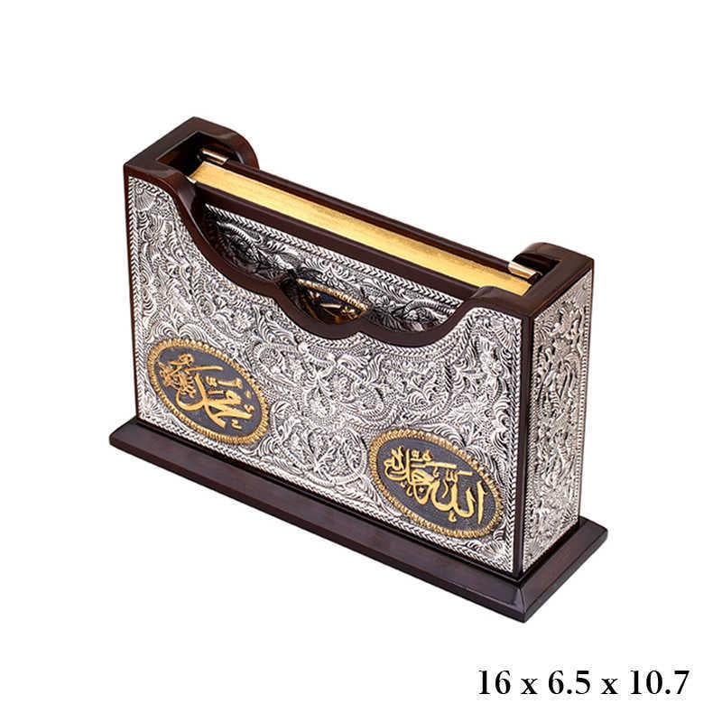 Bu ürün Kur\"an-ı Kerim ve kabı olmak üzere iki parçadan oluşmaktadır. Hem evinize, hem sevdiklerinize manevi değeri yüksek çok özel bir hediye seçeneğidir. Kur\"an-ı Kerim ve kabı ceviz rengi ahşap üzerine 925 ayar gümüş işlemelerle süslenmiştir. Altın rengi olan kısımlar gümüş üzeri altın kaplamadır. Bu şık ve çok özel ürün tamamen el emeği ile üretilmiştir.