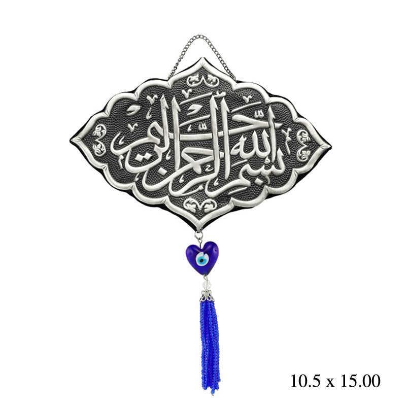 Besmele yazılı nazar boncuklu, püsküllü duvar süsü 925 ayar gümüş ten imal edilmiştir. Evinizin, işyerinizin, ofisinizin duvarlarını bu şık duvar süsüyle renklendirebilirsiniz. Hediye etmek sevdiklerinizi sevindrimek için özel bir seçim. Ürün özel kutusunda gönderilecektir. Ürünlerimizin tamamı el emeği ile üretilmiştir. Gümüş ve değerli taşlar nedeniyle belirtilen ortalama ürün ağırlığında ± %10 sapma olabilmektedir.En: 10.50 cmBoy: 15.00 cm